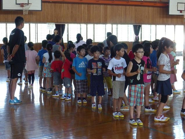 はじめに、学校長から「なつやすみ」の5文字を使った「元気な夏休みのポイント」についての話がありました。次に、学習指導主任の先生から「朝のうちに勉強を」「読書をしよう」「進んでお手伝い」という指導が、児童指導主任の先生から自然災害から身を守るためのポイントについて、DVDを使って指導がありました。
