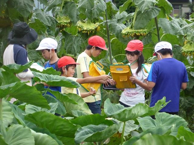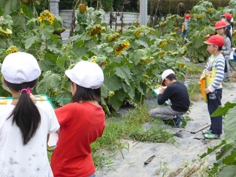 8月31日の5校時は、ひまわりタイムで観察を行いました。花の盛りの過ぎたひまわりは、種子の育つ時期になっています。今日は、各班ごとに分かれてひまわりの花の様子をスケッチしたり、大きさを測って記録したりしました。中には、花によってきたハナアブやカメムシを見つけた児童もいました。