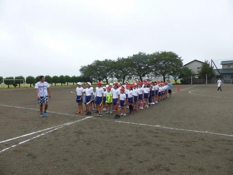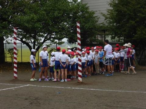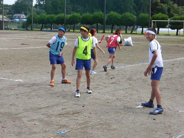 朝は霧雨混じりだったので、体育館で「紅白対抗スーパーリレー」の練習を行いました。紅白を各2チームに分けて、リレー順を確認したり、入退場の隊形を確認したりしました。その後、天候が小康状態になったので、第2校庭でリレーを実際に行いました。低学年はコーナートップが難しいので、高学年の児童が補助をしています。今日の結果は引き分けでした。