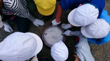 砂の造形活動をしています。各班とも、お城やマンションなどを協力しあって造っています。