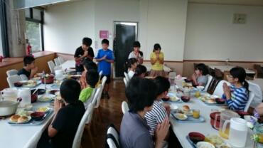 3日めの朝食を食べています。食事の時には毎回、食事係の「いただきます」のかけ声で食べています。