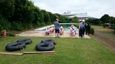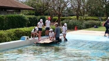 イカダが完成しました。いよいよプールで乗り出します。