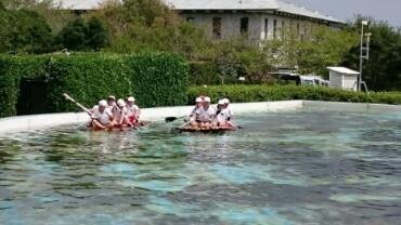 楽しそうにのっています。まっすぐに進まないので、右、左左、など声をかけ合いながら漕いでいます。左(右)に曲がったときは左(右)の人が頑張って漕がないと軌道修正が出来ないことがわかってくると、上手に漕げるようになるようです。