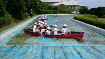 カヌー体験をしています。イカダの様には進めず、苦労しています。特に方向転換が難しいようです。それにしても、いい天気になりました。絶好の水遊び日和です。