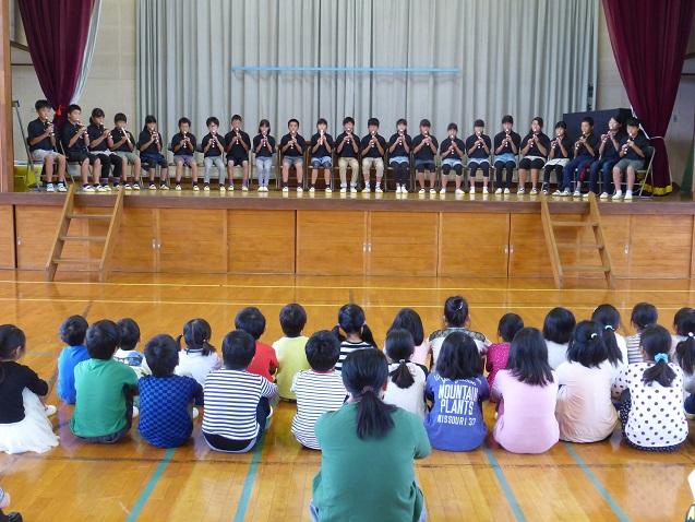 曲目は「見上げてごらん夜の星を」です。児童達は夏休み中から練習を重ねてきた成果を発揮して、きれいに演奏をしてくれました。曲の途中でアルトリコーダーとソプラノリコーダーを使い分けたり、2部パートで演奏したりと工夫された合奏になっています。1~4年生の感想でも、「とてもきれいな演奏でした」「私も5年生になったらリコーダー合奏をしたいです」など、好評でした。