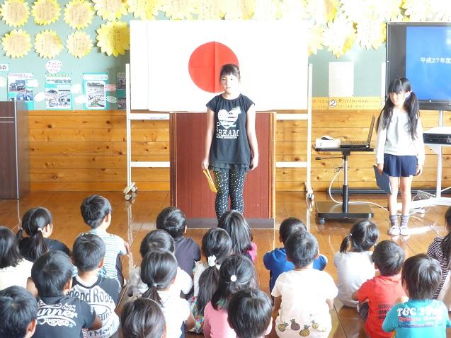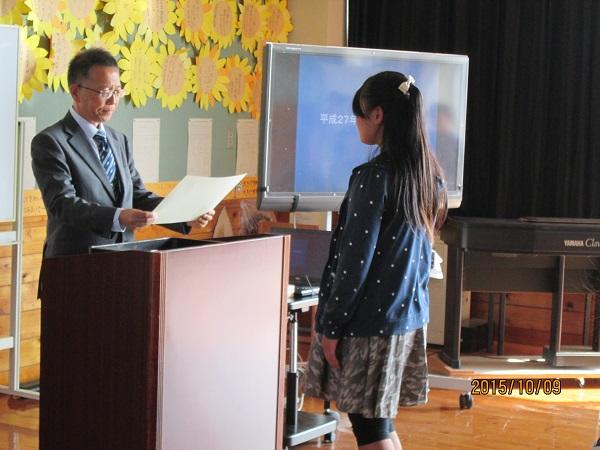 終業式の後は、9月25日に行われた、学校音楽祭の重奏・合奏の部の表彰がありました。続いて、1年生・3年生・5年生の代表児童から、図工の作品作りや運動、計算練習や漢字練習など、それぞれ1学期にがんばったことについての発表がありました。3人とも、全校生を前にして大きな声でしっかりと発表をして、終わった後に大きな拍手を受けました。