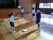 1・2年生の体育は、まず校庭にある遊具を使ってのサーキットトレーニング。そして、体育館で縄跳びです。今、乙畑小の遊びのブームは、縄跳びになってきました。