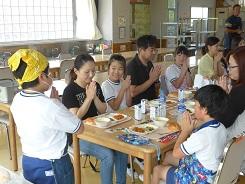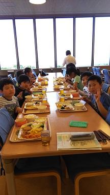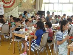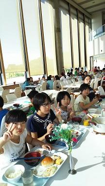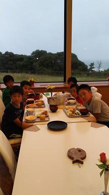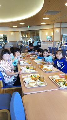 臨海自然教室も3日目になりました。引率の先生からは、「児童14人と引率5人の全員が元気です。5時30分に起床して、6時には荷物整理と部屋の掃除が終わっていました。朝食は7時からです。」との連絡が入っています。写真は、その食事風景です。