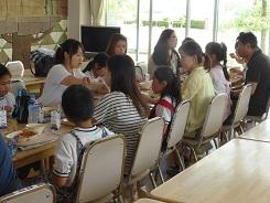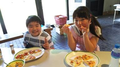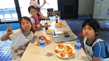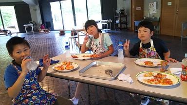 2日目午前の活動であるピザ作りが予定より早く終わったので、12時前ですが、早めのお昼になりました。自分で作ったピザは、格別な味のようですね。