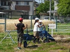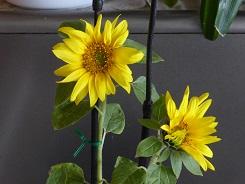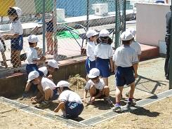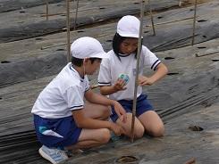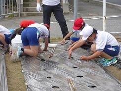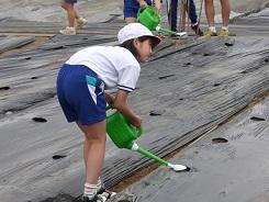 播種・水やり・支柱を立てて鳥よけの糸張りまで、高学年の児童を中心によく作業をしてくれました。奇しくも4月に鉢に播種したヒマワリは、背丈は低いのですが本日開花しました。時期を変えて播種したものがすでに発芽し生長しています。今回は、開花までに約3か月かかりましたが、4月に比べて気温が高くなっているので、これからはもっと早く次々に開花すると思います。