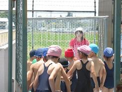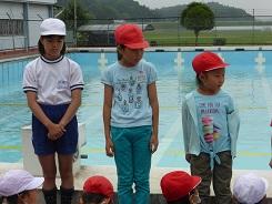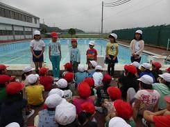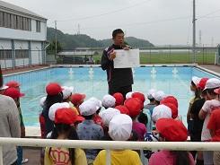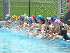 児童の目標発表では、「バタフライができるようになりたい。」「クロールを友達に教えてあげたい。」「息継ぎが上手にできるようになり、25mを泳げるようになりたい。」など、各自の泳力に応じた内容をしっかりとすることができました。約2か月の間に児童が水に親しみ、泳力を伸ばせるよう指導していきます。