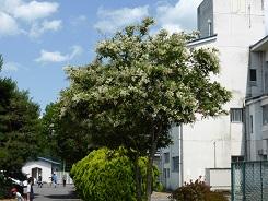 本校は多くの木に囲まれた、緑豊かな学校です。過去に地域の方々やPTAの方のご協力をいただいて環境が整ってきた歴史があるとうかがっています。春にはサクラやフジの花が進級や新入生を祝ってくれています。体育館への渡り廊下から見えるウメの実も育ってきており、現在はナツツバキの花が咲いています。