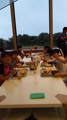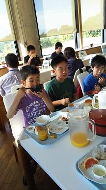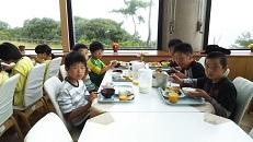 2日目の朝食の様子です。朝日に満ちた眺めの良い食堂で、気持ちのいい朝食を取っています。昨夜の「早寝」、今朝の「早起き」、そして「朝ごはん」と、しっかりとしたリズムで生活ができていているようです。今日も一日、元気に活動できそうですね。