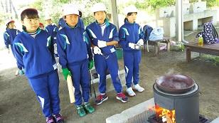 火起こしは、5年生の理科で学習した「燃焼」の知識が役立つのですが、「知っている」ことと「活用できる」ことは異なるので着火に苦労するグループがあるようです。現在は火起こしができたので、海水の煮立てになっています。イオン交換による塩化ナトリウムではない天然の塩を作っているので、ミネラルたっぷりのおいしい塩になると思います。お土産になる予定ですので、ご家庭で是非味わっていただければと思います。