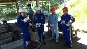 2日目の午前中の活動、塩つくりです。始めに作り方の説明を聞いて、海水を汲みに海岸まで行きます。上手に汲まないと砂が多くなってしまいます。また、欲張ってバケツにたくさんの水をくむと重いうえに、運んでくる途中の階段などでピチャピチャとこぼしてしまう事が多いようです。今回は、各班ごとにバケツ7分目の海水を汲んだようです。海水の塩分濃度は約3%なので、1Lの海水を蒸発させれば30gの塩が取り出せることになります。今回は時間の関係でそこまでの量を蒸発させないので、一人あたり数g程度の塩になるでしょうか。