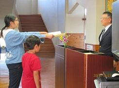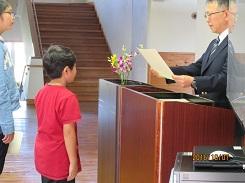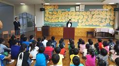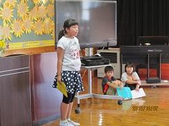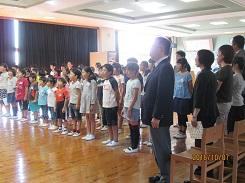 10月7日の昼休みに1学期終業式を行いました。終業式では、国歌斉唱、学校長の話、代表児童による1学期の反省発表、校歌斉唱を行いました。本校の児童は大きな声で歌えるので、多目的ホールに声が響きわたります。学校長からは、「1学期の目標を振り返って、2学期の目標を具体的に計画しよう。」という内容の話がありました。なりたい自分になれるような具体的な目標を秋休みの間に考えられるよう願っています。また、代表児童の発表では、1年生・3年生・5年生がそれぞれ大きな声でしっかりと発表することができました。1年生は原稿を見ながらしっかりと、3年生と5年生は用意していた原稿を一度も見ないで堂々と発表しました。
