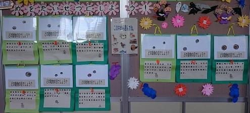 10月の保健室前廊下の掲示は、「目をたいせつにしよう」です。いろいろな動物の目についてのクイズになっています。「まつげが2列に生えている動物」「暗闇でヒトの6倍も見える動物」など、生活環境でそれぞれに特徴があることが分かります。ご来校の時に時間がありましたら、チャレンジなさるのも楽しいかと存じます。全部で9問あります。