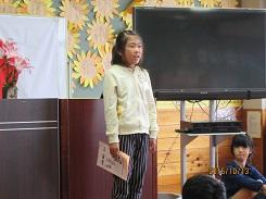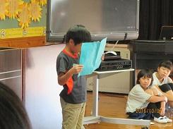 10月25日の朝、1年生が国語の教材にある「くじらぐも」の音読を、物語の中に登場する1年2組の子どもの役をする児童、くじらぐもの役をする児童、ナレーションの役をする児童の役割分担で音読しました。音読の途中では、場面に合せて合唱をしたり、みんなで雲に乗るためにジャンプをしたりするなど、手振り身振りを交えながらの楽しい音読劇でした。