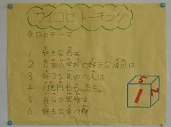 最後の感想発表では、「普段は話をしない内容の事が聞けたので、楽しかった。」「いろいろなことが聞けたので良かった。」等がありました。児童がサイコロを振って数字を確認するときの、ワクワクとした表情が可愛らしかったです。