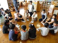 10月20日の朝、読み聞かせを行いました。本日の読み聞かせは、いつもお世話になっているお話ポットの会の方でなく、本校に図書事務として勤務している熊田先生と矢板市立図書館に勤務なさっている井田様がしてくださいました。