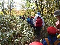 昨年度は、全学年が縦割り班でミツモチ山まで深い霧の中でのハイキングとなりましたが、今年度は体力に応じて2つのコースに分けてのふるさと学習にしました。高学年では昨年度より体力的に厳しいコースですが、その分、八海山神社からの眺めは格別のものになると思います。下見では、活動中のシカや、冬にシカが樹皮をかじった跡を発見してきたそうです。八方湖方面では牧場に電柵もあるので、安全にハイキングができるよう、事前指導をしっかり行って学習に望む計画を立てています。