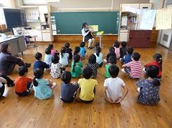 熊田先生は1・と2年生に2年教室で、「にゃーご」「ねこどけい」「ねこ どんなかお」と猫を題材にしている絵本3冊を読み聞かせてくださいました。また、井田様は3年生~6年生に多目的ホールで、「少年と子だぬき」「これ なんとよむ? たべもののかんじ」を読み聞かせてくださいました。