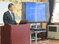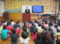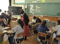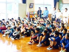 朝、8時頃から校庭等の校舎周りを確認していただいた後、1校時に学校経営全般を、2校時と3校時に各担任の先生の授業を、4校時に学校に備えておくべき帳簿関係を確認いただきました。給食の様子をご覧いただき、児童が下校した5校時終了後に授業や学校経営についての指導・助言があり、その後、全体講評となりました。全体講評では、一日かけていろいろな視点から本校教育の確認をいただいた事をもとに、さらに充実した学校教育を実施するためのアドバイスをいただきました。講評の最後に、「乙畑小学校ですばらしい教育に触れることができたことに感謝」して、教育事務所長様が「この広い野原いっぱい」の歌をプレゼントしてくださいました。赤いリボンで結んである花束をスーツの内側から出すという演出もあり、参加者一同でありがたくいただきました。