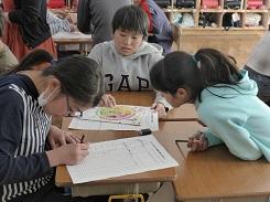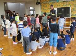 お題は、バイオリンなどの楽器や、歯磨き、ブランコなどの日常生活に沿ったものが出されていました。ちょっと照れながらジェスチャーをして、当ててもらうとほっとした表情をする児童や、上手にできないので上級生に手伝ってもらった低学年の児童もいました。助け合いながら、楽しいひとときを過ごしました。
