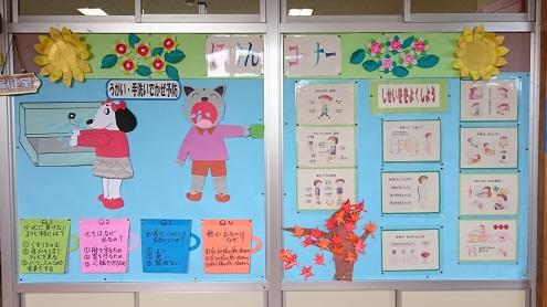 11月の保健指導のテーマは、骨についてです。それに関連して「よい姿勢」についての掲示がされています。また、寒さが厳しくなり体調を崩す児童が多くなってきているので、カゼの予防「うがい・手洗い」についての掲示もされています。学校では、11月28日に、国際医療福祉大学塩谷病院の協力を得て、手洗い講習会を実施する予定になっています。カゼなどの予防には、手洗いが基本であり、とても有効なのだそうです。病気にかからないために、正しい習慣を身につけさせたいものです。