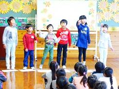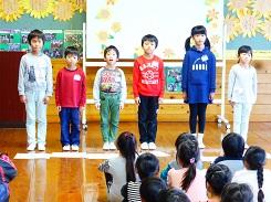 2年生の在籍は6名なので、一人あたりの分担量も多くなりますが、全員が自分の分担を暗記して、大きな声でしっかりと発表出来ました。場面絵や、身振りや手振りを加え工夫した音読をしてくれたので、楽しく聞くことができました。