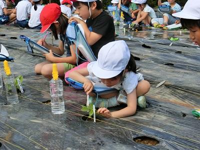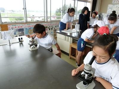 今日のメニューは「田んぼの水の中にいる、微生物を顕微鏡でみてみよう」です。まずは肉眼で観察しました。1,2年生は解剖顕微鏡で観察、3年生以上は顕微鏡で観察です。顕微鏡の操作は6年生がお手伝いしました。あらかじめ理科支援員の先生が、いろいろな向きのミジンコのプレパラートを作っておいてくださったので、のぞきこんだ子供たちは「動いている!」と大喜びでした。