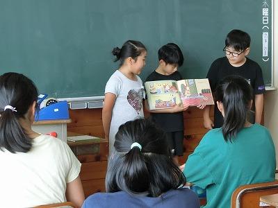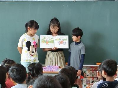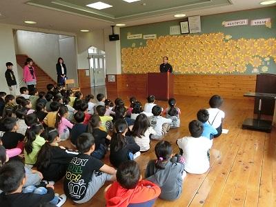 4年生による音読集会です。かなりの長文ですが分担して、全校生にわかりやすく発表していました。迫力満点でみんなの目と耳は4年生にくぎ付けでした。