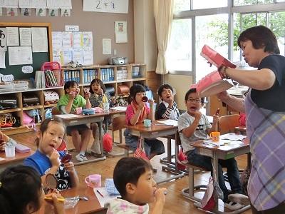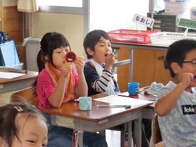 6月は全学年に養護教諭による歯磨き指導があります。今日は2年生の学習です。歯垢を染めて、磨き残しチェックです。大きな歯の模型を使って正しい磨き方を学習しました。
