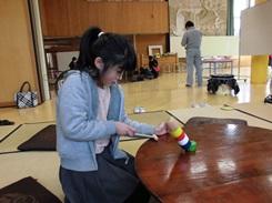 次に郷土資料館に行きました。石器や土器を見学し、説明を聞いたり、実際にさわったりして学習しました。 昔遊びの体験では、ベーゴマ回しや羽子板、だるまおとしで楽しみました。