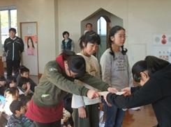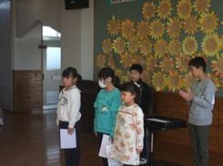 代表児童が手紙を読んでお渡しすることができました。いつも本がきれいに並べられている事、借りる本についてお話していただける事への感謝、それから給食の配膳に気を配っていただき、おいしくて安全な給食が食べられる事への感謝を伝えることができました。お二人の先生からお話していただいた後、全校合唱「ビリーブ」を歌いました。