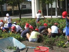 9月15日(金)昼休みは緑活動でした。ひまわり班に分かれて、花壇の除草をしました。除草と枯れてしまった花の始末をして、花壇をきれいにしました。最初に担当の先生から鎌やスコップを使って草を根ごととる方法を教えてもらいました。みんながんばって根っこもきれいに取ることができました。