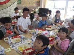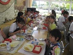 9月21日(木) 1年生 4年生 6年生 と職員室の先生方とのふれあい給食でした。ランチルームでの給食です。テーブルごとに、各学年1人ずつ、誰と一緒になるかはそのときのお楽しみ。職員室の先生方も楽しい会話がはずみ笑顔あふれる給食でした。