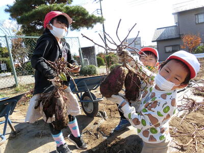 11月4日から5日にかけて兄弟学年での「さつまいも掘り」を行いました。1年生は6年生と、2年生は5年生と、3年生は4年生と一緒になって、上学年が下学年の面倒を見ながらの活動となりました。今年は、とても大きなさつまいもが収穫でき、どの学年も満足そうでした。