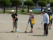2校時はグランドゴルフを第2グランドで体験しました。グランドゴルフは、昭和57年に鳥取県東伯郡泊村生涯スポーツ活動推進事業の一環として、泊村教育委員会が中心になり考案されたもので、高度な技術を必要とせず、しかも全力を出す場面と、集中力や調整力を発揮する場面がうまく組み合わされており、ルールも分かり易く、取り組みやすいスポーツだそうです。松寿会の方々からのアドバイスを受けてゲームを体験した児童の中には、ゲームに慣れてきた後半に2打でトマリにする児童もいました。