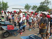 主任技術員の田代さんが事前に耕耘機で耕しておいた花壇に、ひまわり班で植えていきました。これからは、水やり、追肥、雑草ぬき等、きれいな花をたくさん咲かせるために、手入れが必要になってきます。水やりはひまわり委員会、雑草ぬきは緑の少年団等、いろいろな立場で児童が関わって世話をしていくことになります。