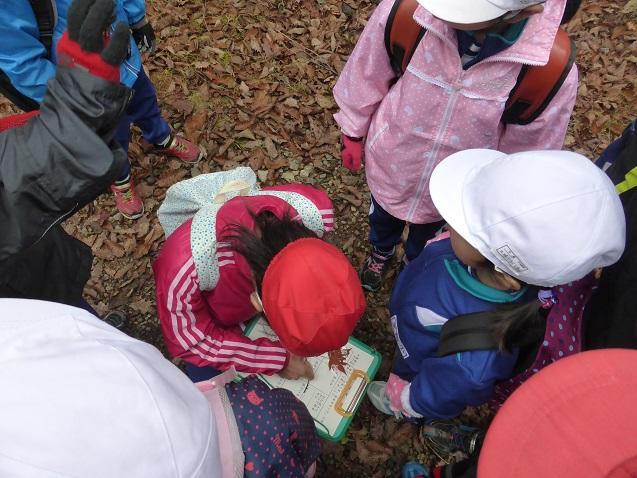 大間々から縦割り班でミツモチ山まで、「穴の開いた葉を探そう」「ドングリを探そう」など、いくつかの課題を解きながら向かいました。また、大きな葉を見つけて仮面にしてみたり、大きなカエデの葉を団扇にして楽しんだりしながらの登山となりました。