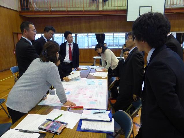 児童が下校した後は、参観者全員が体育館に集まり、本日の授業についてグループに分かれて検討を行いました。活発な討議をしていただき、今後の指導の参考になる意見をいただきました。