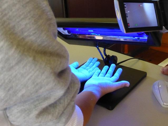 病原菌がどこにいるのか、どのように感染するのか、正しい手の洗い方について学習した後、病原菌に見立てた蛍光クリームを手に塗り、手洗い後の手を観察することで、正しく手を洗えたかを一人一人確認しました。下学年にはやや洗い残しが見られた児童がいましたが、上学年は上手に手洗いができたようです。