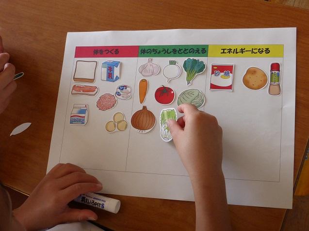 3年生は、食べ物の3つのはたらき「体をつくる」「体のちょうしをととのえる」「ねつや力になる」について学習し、いろいろな食材を3つに分類しました。その後、バランスのよい食事がとれるよう、バイキングメニューから選んでいく学習をしました。