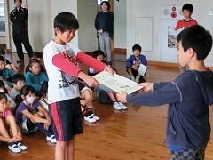 台風一過のすがすがしい天気の中、全員が元気に登校しました。朝の活動は、児童集会でゲームをしました。全校児童が一緒になって楽しむことができる環境は素晴らしいと思います。その後、児童会から運動会スローガンの表彰を行いました。