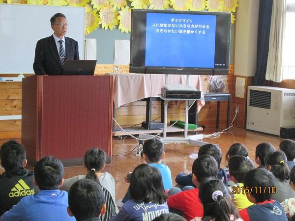 11月10日の朝は、朝会がありました。今回の朝会は学校長からノーベル賞について、日本人は今回の受賞者を含めて24人の受賞者がいること、物理学賞の受賞者数は世界2位(1位はアメリカ)であること、晩餐会のカラトリーは日本製であること、授賞式はノーベルの命日である12月10日であることなどについて、話がありました。