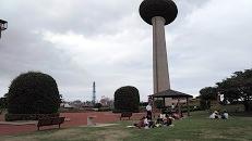 港公園での昼食風景です。港公園は鹿島港の中にあり、鹿島製鐵所のある鹿島臨海工業地帯に隣接しています。雨が上がったので、公園内でお弁当を食べることができました。このあとは、バスに乗り一路学校へ向かいます。