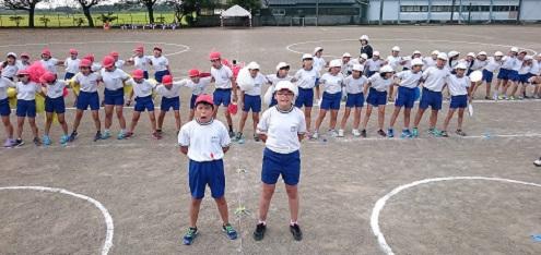 給水タイムのあと、応援合戦の入場を練習し、練習が必要だった応援の振り付け等を紅白に分かれて練習しました。高学年の児童が応援歌の時の動きを、低学年に指導する姿がありました。その後、よさこいソーランの位置を確認し練習を終えました。