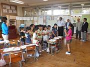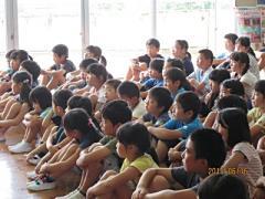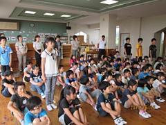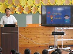 あいさつのあと、先日行われた矢板市小学校陸上競技大会の表彰がありました。全種目を代表して、6年の児童が賞状を受け取りました。落ち着いて、しっかりとした表彰式でした。続いて、学校長の話がありました。今回は、「つゆ」に関する話で、「熱中症」「食中毒」に注意が必要であるということと、植物にとって大切な雨が降る季節であるという内容でした。