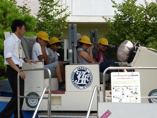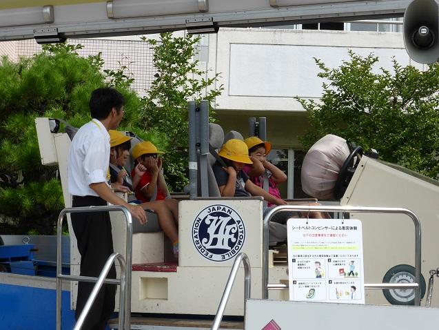 シートベルトコンピンサーでの体験では、時速5kmで急停止した場合の衝撃とシートベルトの重要性を体感しました。体験車に乗車した児童は、シートベルトを迷わす着用しているので、シートベルトを使い慣れていることが伺えました。